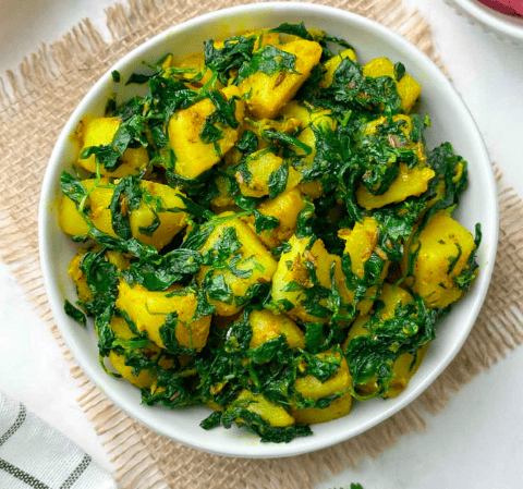 Fresh fenugreek leaves saut?ed with tender potatoes, harmonizing with aromatic spices, creating a wholesome dish rich in flavor and nostalgia of home-cooked comfort.