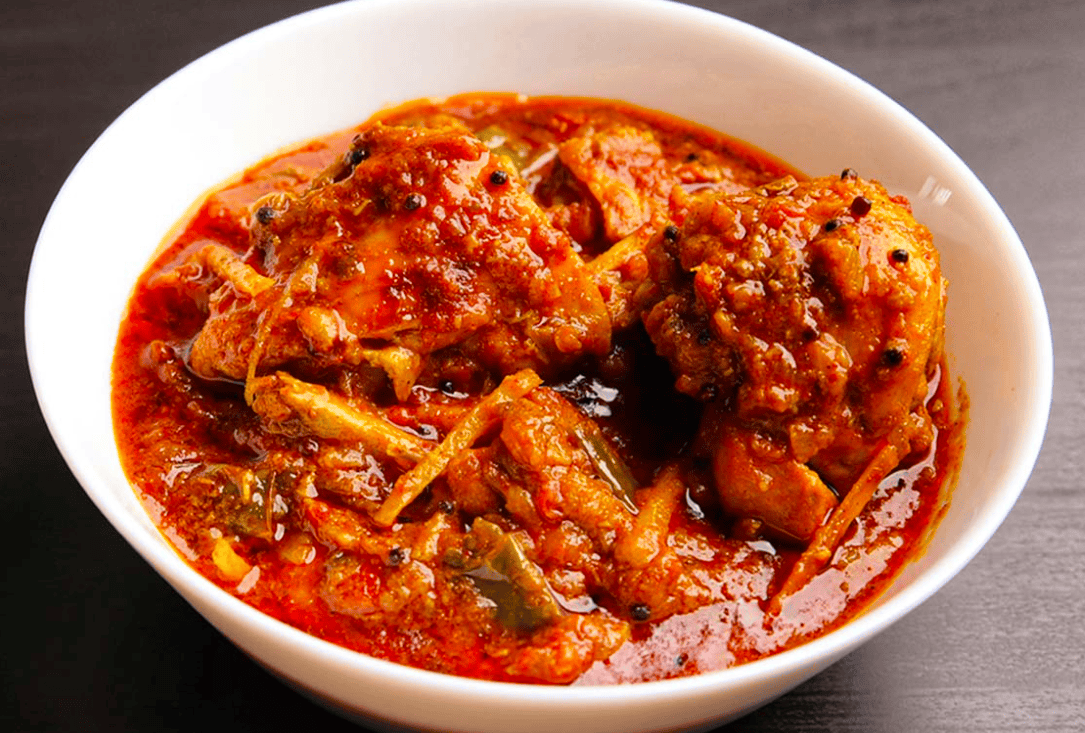 Juicy chicken pieces marinated in a tangy blend of pickling spices, slow-cooked in a creamy tomato-based gravy with onions, creating a bold and flavorful dish that tantalizes the taste buds