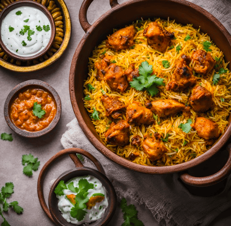 Chicken Tikka Biryani combines succulent, spiced chicken tikka with aromatic basmati rice, layered with fragrant spices and saffron. A flavorful and indulgent dish that perfectly blends smoky and savory flavors.