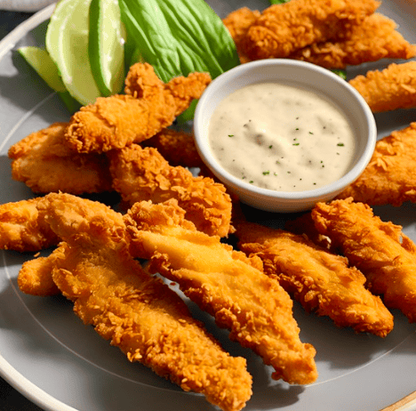 Chicken Fingers are tender strips of chicken, breaded and fried to a crispy golden brown, offering a delicious and satisfying snack or appetizer.. Served with one dip.